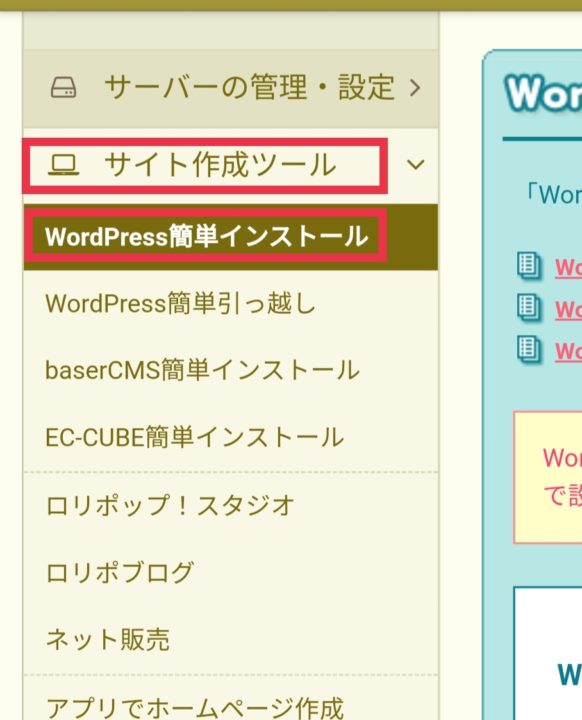サイト作成ツールを選択しWordPress簡単インストールを選択します。